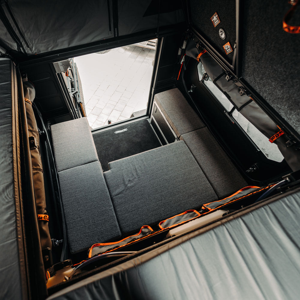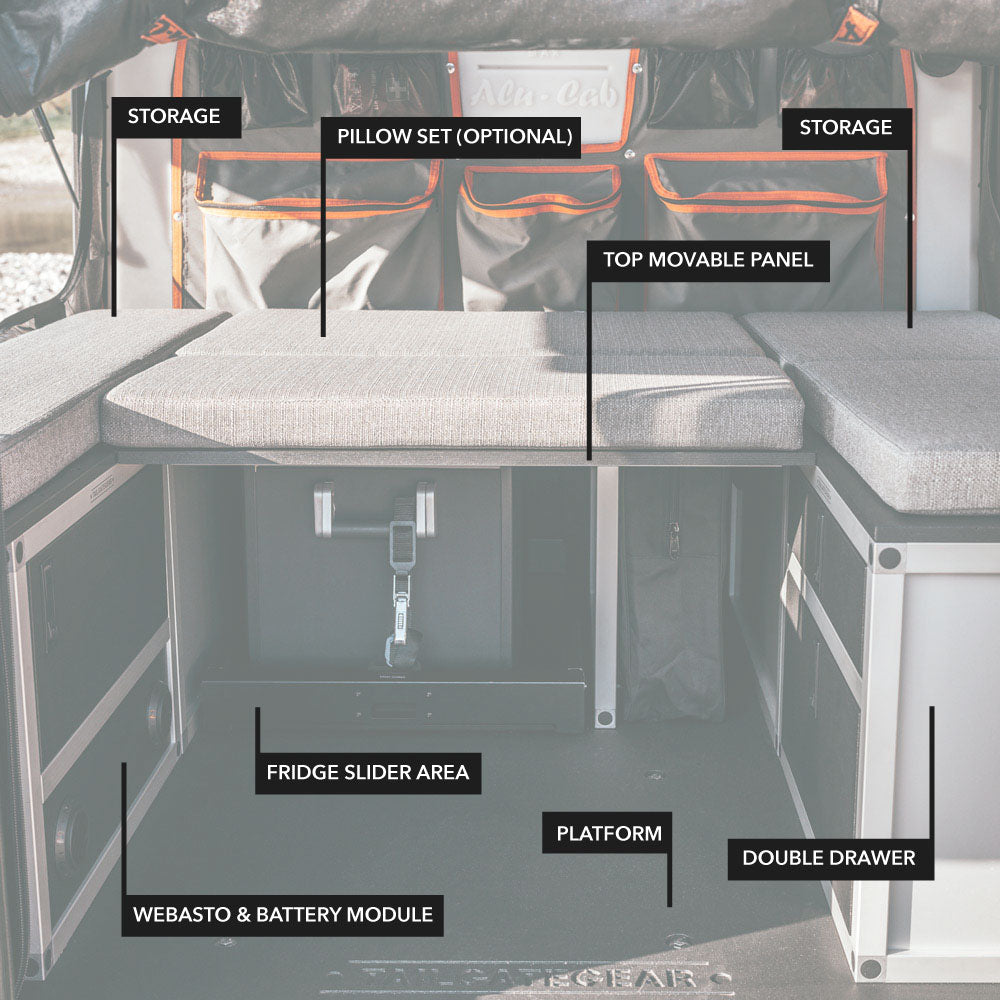 We have devised an interior setup for the world famous Alu-Cab Canopy and ModCap Camper that turns the empty living quarter into a functional, sturdy and flexible space for solo travellers, couples and even families with children.