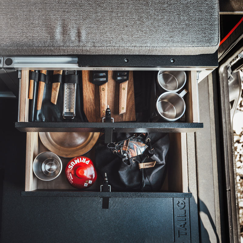 The price includes the platform system; the four (4) modules: double drawer, webasto/electrical module, two storage modules, movable panel(s), Lagun table option (if selected), the cushions (if selected); the installation guide; the installation toolkit.