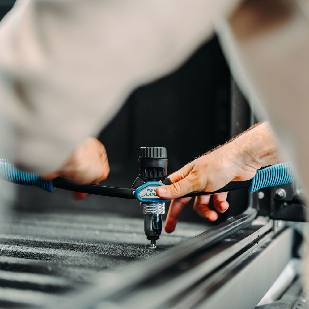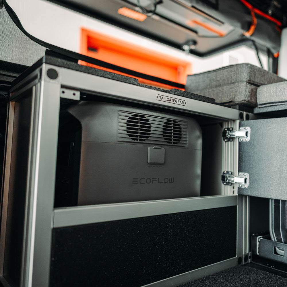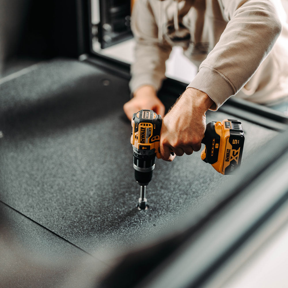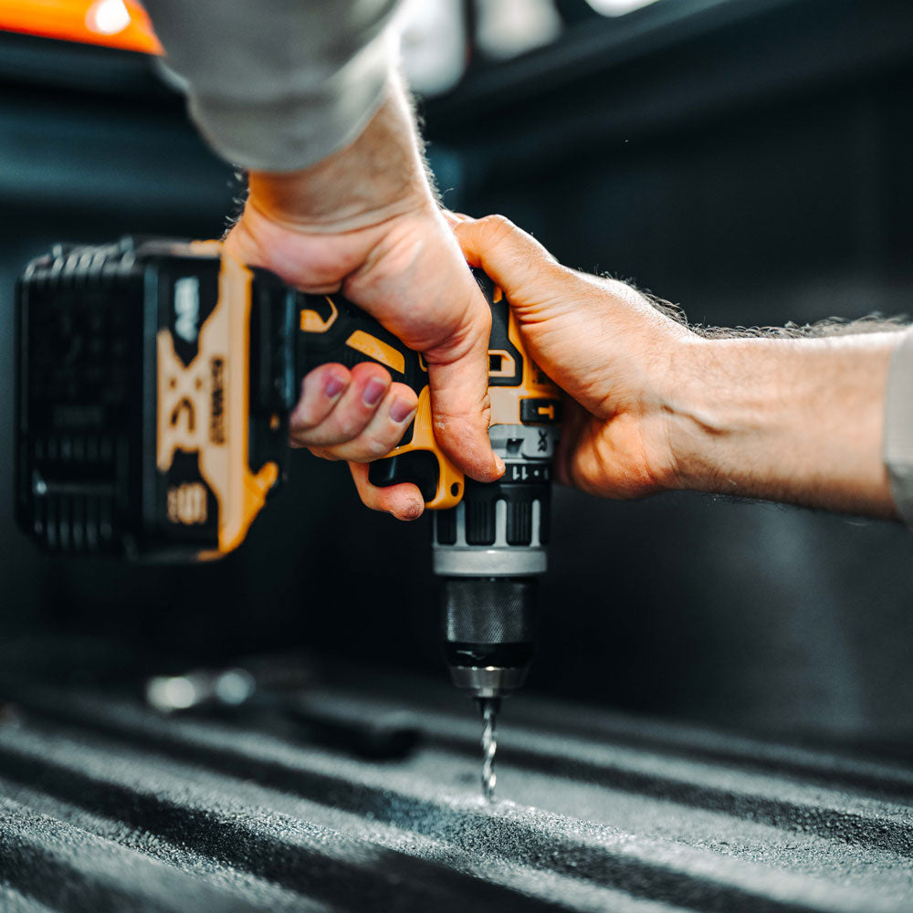 This setup requires drilling to install rivnuts in the load bed to secure the platform onto which the modules are installed.