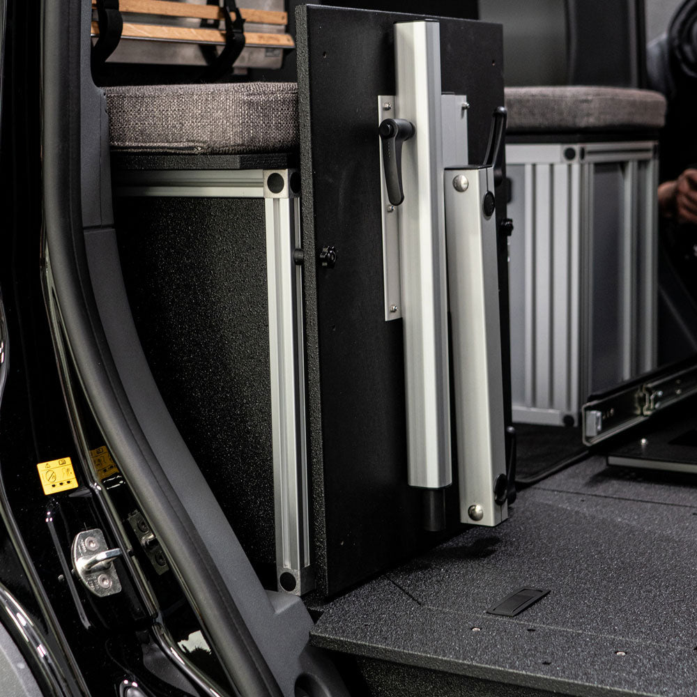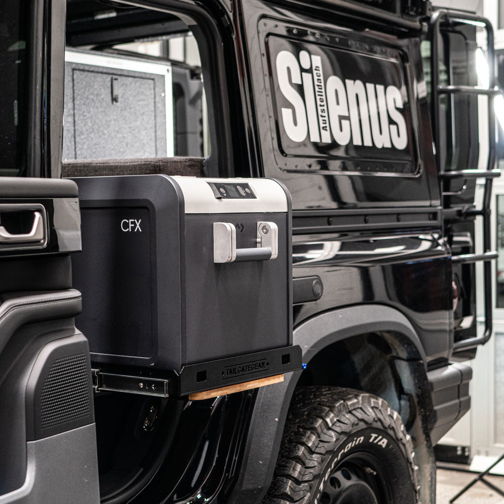 Installed to slide out from the side doors (inner door hinge must be freed). The fridge can also be easily opened inside the vehicle. The slide can be installed on either side of the vehicle.