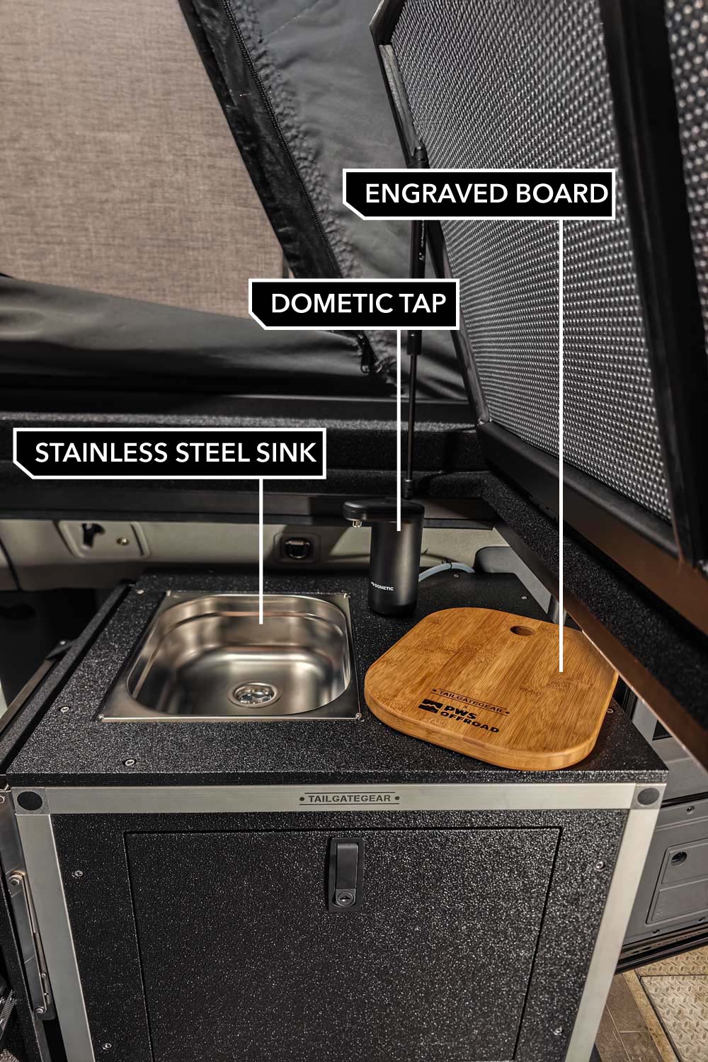 You will get the stainless sink with a connection to a grey water tank. In addition, the inlet to refill your fresh water tank is included with a food grade tube to be connected to your preferred water system.